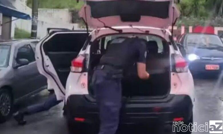 Chegando ao local, os guardas localizaram o veículo e, em seguida, foram até um bar onde o condutor do carro havia entrado. Dentro do estabelecimento, encontraram um homem com as características informadas e o detiveram. De volta ao veículo, a equipe localizou um revólver calibre .38 municiado, o que configurou porte ilegal de arma.
