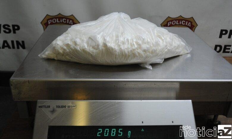 O homem foi conduzido à sede policial. Os pertences foram periciados. Na mala do suspeito foi localizado um fundo falso contendo mais de dois quilos de cocaína. O homem foi preso em flagrante.