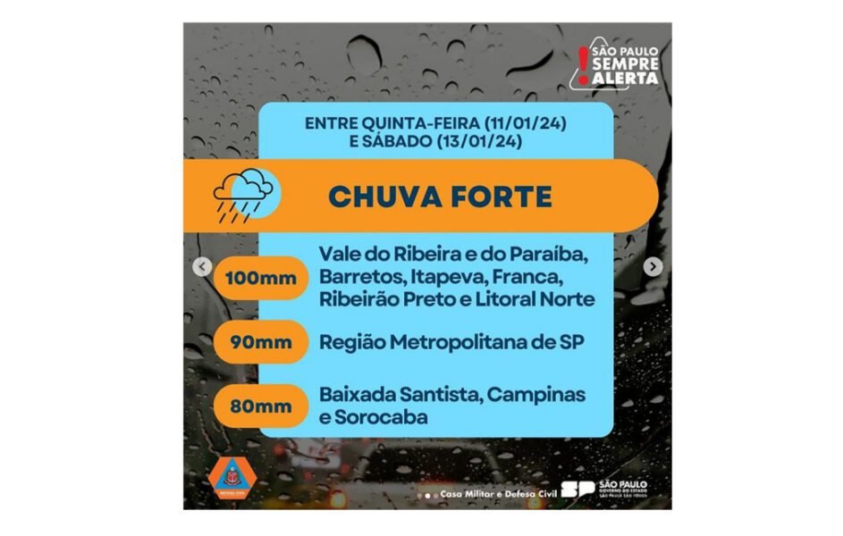 Nas regiões metropolitanas de São Paulo, Baixada Santista, Campinas e Sorocaba, a previsão é de índices variando de 80 a 90 mm durante o mesmo período.