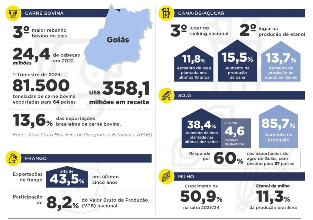 O Instituto Brasileiro de Geografia e Estatística (IBGE) aponta que Goiás tem o terceiro maior rebanho bovino do país, com 24,4 milhões de cabeças em 2022. O Estado também ocupa a terceira posição entre os maiores produtores de grãos do país na última safra, segundo levantamento divulgado pela Companhia Nacional de Abastecimento (Conab).