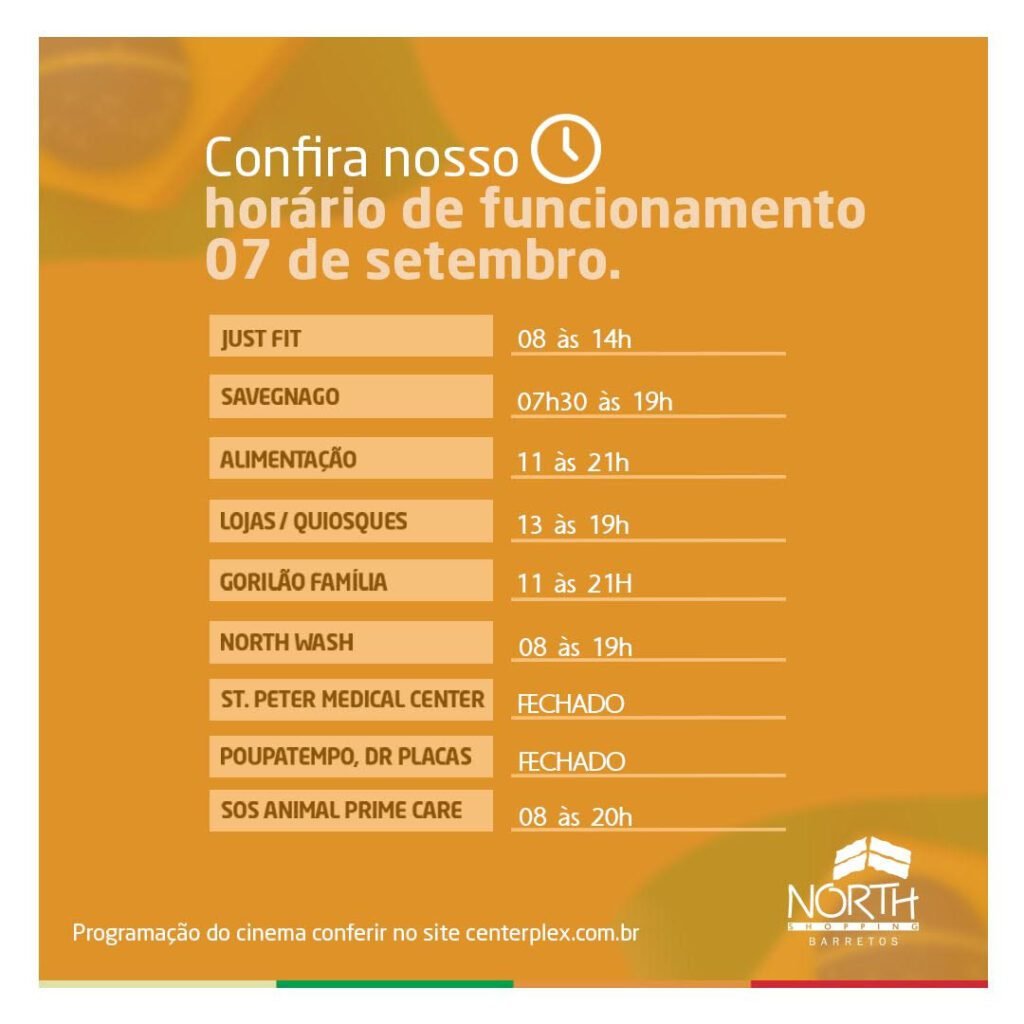 Os horários do North Shopping Barretos voltam à regularidade após o período de Festa do Peão e no feriado de 7 de setembro, ficam assim: