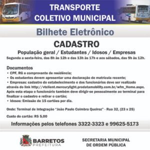 O cadastro da população em geral, empresas, estudantes e idosos para o bilhete eletrônico (cartão) do Transporte Coletivo Municipal continua no Terminal de Integração “João Paulo Coimbra Queiroz”, na Rua 32, entre as avenidas 23 e 25, de segunda a sexta-feira, das 8h às 12h e das 13h às 17h e aos sábados, das 9h às 12h.