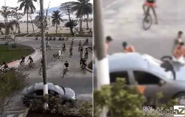 Bandidos em bicicletas abordaram o motorista de um carro em São Vicente, litoral de São Paulo. As imagens foram filmadas por uma moradora, no sábado (26).