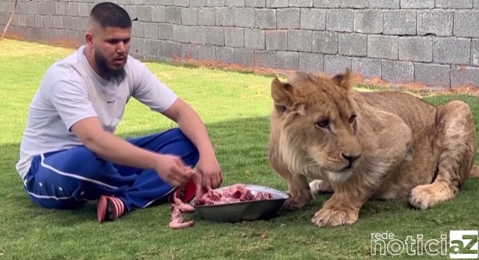 O líbio Abdel Fattah Al-Saadi desafia as normas ao criar um leão como animal de estimação em Trípoli, Líbia.