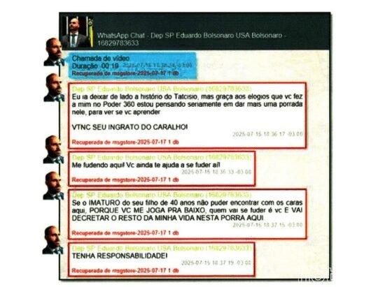 Mensagens de WhatsApp divulgadas pela Polícia Federal nesta quarta-feira (20) expõem um embate entre o deputado federal Eduardo Bolsonaro (PL) e o pai, o ex-presidente Jair Bolsonaro (PL). Irritado com declarações do ex-chefe do Executivo, Eduardo chegou a xingá-lo de “ingrato do caralho” e escreveu a abreviação de um palavrão (“VTNC”).