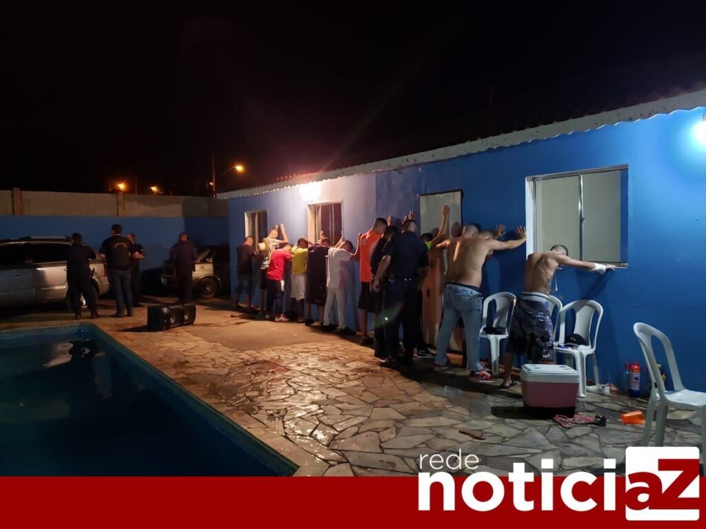 Por volta das 20:00 fomos acionados para verificar um evento que estava acontecendo na Estrada do Rossi no bairro do Pau Arcado, local este já conhecido pelas equipes, chegando no local fomos autorizados a entrar pelo proprietário. No local foi constato um grande número de pessoas, aproximadamente 40 pessoas e o uso continuo de entorpecentes e bebida alcoólica, além da perturbação do sossego. Quando as equipes adentraram de imediato correu um indivíduo para o fundo do local, que posterior foi constatado que havia uma Abertura no.muro, onde facilitaria a fuga. Na revista pessoal aos participantes do evento foi encontrado mais drogas. Durante a revista umas das participantes que portava também drogas, se exaltou e veio a proferir palavras de baixo calão e tratar com rispidez os agentes de segurança, momento este que foi dado voz de prisão em flagrante por Desacato. Após a revista geral os demais participantes do evento foram liberados de forma a retornar para suas residências. O proprietário do local e a participante foram conduzidos ate a Delegacia da polícia civil, onde a autoridade policial ratificou o Boletim de ocorrência, sendo o proprietário enquadrado no Art 268 do código penal, por infringir os decretos estaduais e municipais, por não poder haver aglomeração de pessoas devido a proliferação da doença. A participante irá responder pelo crime de desacato e será investigada pelos entorpecentes que se encontravam no local. Participaram da ocorrência 20 gcms e 8 viaturas. Sendo comandados pelo GCM Santana e apoiados pelo Diretor de Segurança Galvão.