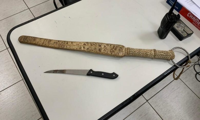 A Guarda Municipal foi acionada para atender uma ocorrência próximo a um supermercado na região Central da cidade nesta quarta-feira. A viatura se dirigiu ao local e constatou que um senhor estava alterado e depredando um caminhão estacionado. Ele portava um chicote e uma faca, considerada arma branca.