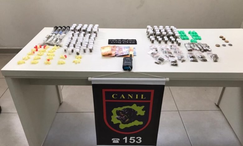 Com ele havia um rádio comunicador, 34 pinos de cocaína, seis pedaços de maconha e 51 porções para venda no varejo da mesma droga, além de R$ 93,50.