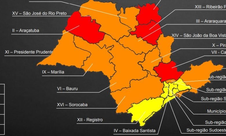 Mantiveram-se na fase vermelha, que é a mais restrita, em que apenas atividades essenciais estão liberadas – as regiões de Araçatuba, Franca, Ribeirão Preto e Campinas, onde a taxa de ocupação de leitos de Unidades de Tratamento Intensivo (UTIs) continua acima de 80%.