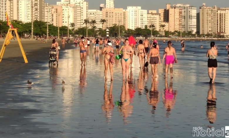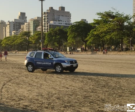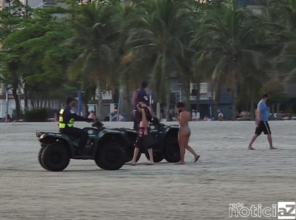 Praia lotada o dia inteiro. A Guarda Municipal de Santos marcou presença em várias posições para que os frequentadores respeitassem o decreto para que todos em locais público usem máscara de proteção contra o Covid-19. Os Guardas usam carros e quadriciclos na faixa de areia.