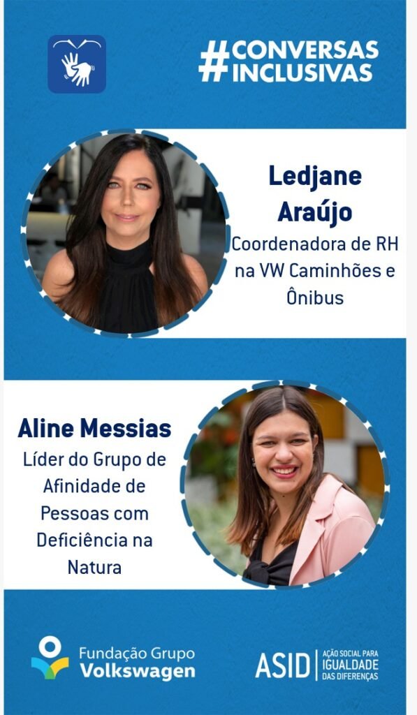 A ASID (Ação Social para Igualdade das Diferenças) está promovendo no segundo semestre de 2020 sua série de webinários “Conversas Inclusivas”. O evento conta com a parceira da Fundação Grupo Volkswagen e vêm debatendo temas cruciais para a inclusão das PcD na sociedade e no mercado de trabalho. O quinto webinário acontece na próxima quinta-feira, 06/08, a partir das 16h, e abordará o tema “Empresas referências em inclusão de PcD: o que elas têm feito?”. O webinário contará com a presença de Ledjane Araújo, coordenadora de RH na VW Caminhões e Ônibus, Augusto Runte, também do grupo VW, e Aline Messias, Líder do Grupo de Afinidade de pessoas com Deficiência na Natura. Durante a live serão apresentados cases de sucesso e dicas práticas para a inclusão de pessoas com deficiência nas empresas.