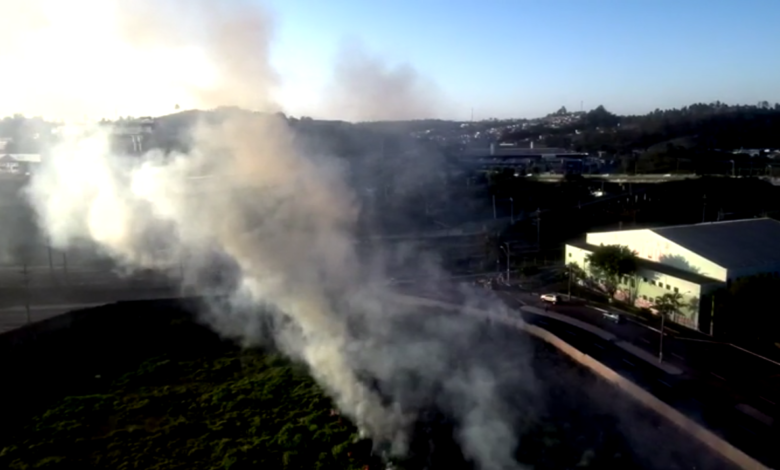 As imagens feitas com um drone mostram o fogo em uma área de vegetação, no centro de Várzea Paulista. O local foi destinado a instalação de um shopping. O Local é murado. O uso do equipamento serviu para avaliar a extensão do incêndio e qual seria a melhor forma de acessar o local.