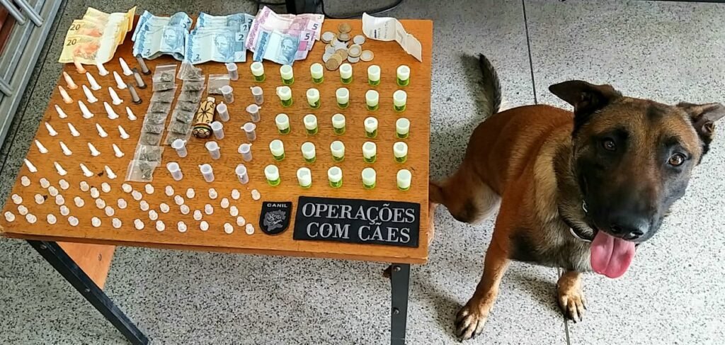 Neste momento foi chamado. O K9 Zork, fez uma varredura e encontrou drogas escondidas em uma lixeira do outro lado da via.