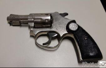 Todos foram abordados. Foi realizada busca pessoal, com D.F.S. e A.M.A., nada de ilícito foi encontrado, já com E.V.A., foi localizado um revolver cal.22 em sua cintura.