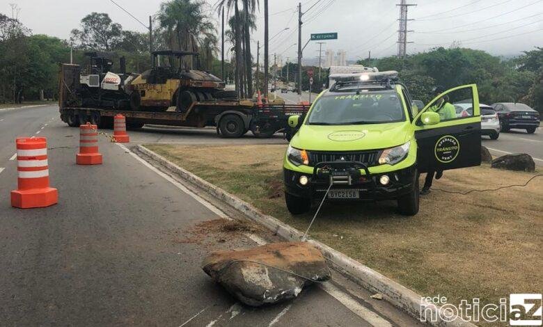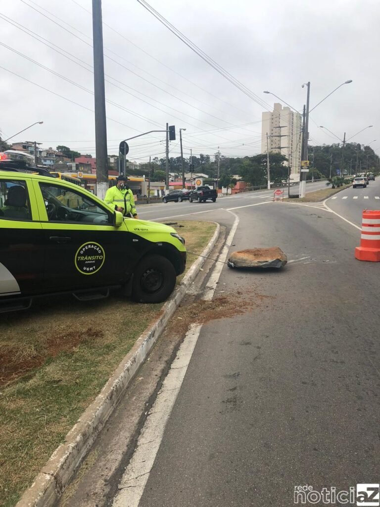 Os Agentes de Trânsito, David e Rodrigo, tiveram que usar o guincho do carro de trabalho para retirar a pedra no meio da Rodovia. Com as mãos ninguém conseguiu mover o pedregulho.
