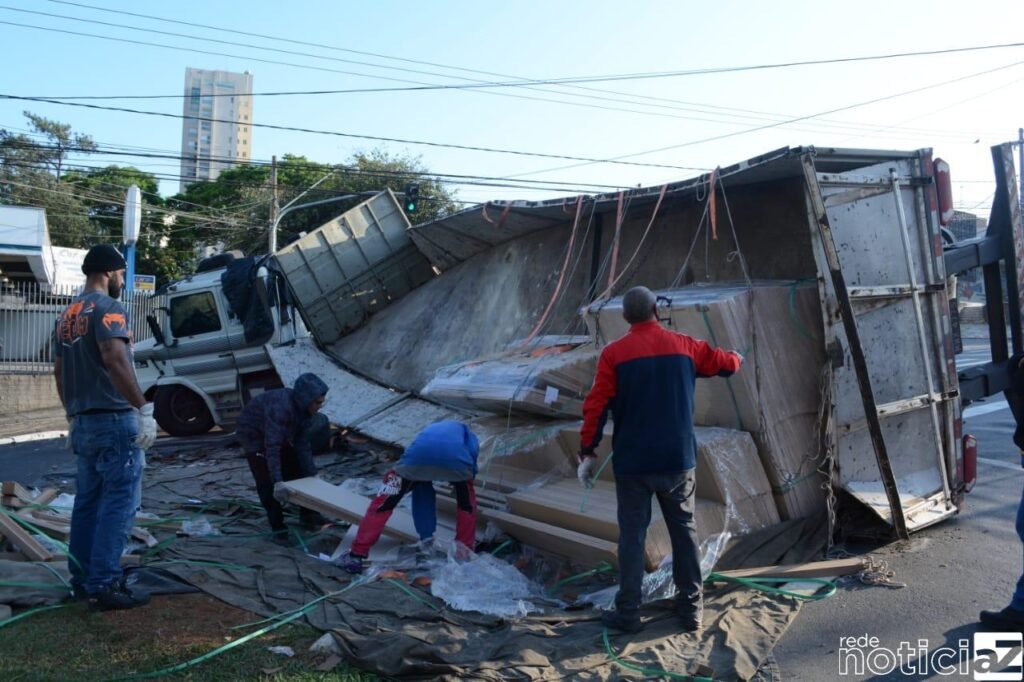 A carreta carregada de pisos que tombou na Avenida Jundiaí com Avenida. Senador Cesar Lacerda, numa conversão proibida foi retirada do local, em Jundiaí, agora pela manhã(17/10). Veja o vídeo.