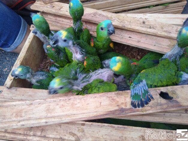 Sendo assim, nada de ilícito encontrado na busca pessoal, porém ao realizar a busca veicular foi verificado o crime. Os Policiais localizaram diversas aves silvestres sendo transportadas de maneira ilegal e sem qualquer autorização do órgão ambiental. No total 165 papagaios e 01 Arara Vermelha. Os dois homens foram responsabilizados por crime de maus tratos, transporte ilegal e tráfico de animais silvestres.