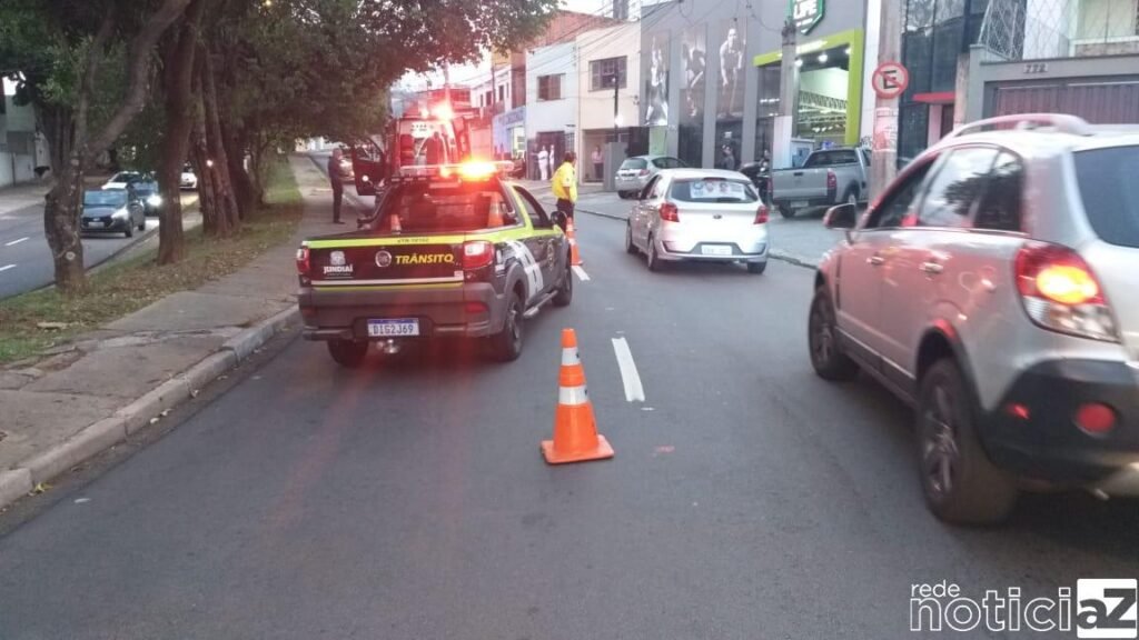 Um carro e uma moto bateram na Rua das Pitangueiras, em Jundiaí. Houve muita lentidão no local e o motociclista foi a vítima da colisão ficou isolada até a chegada do SAMU e dos agentes de trânsito.