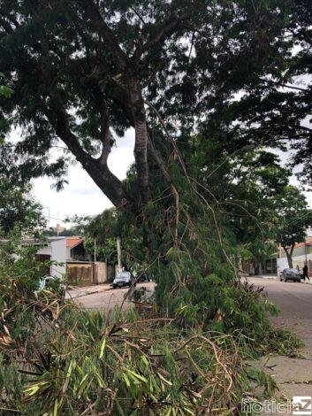 Os moradores dizem também que a árvore aparentemente está podre. Para comprovar a afirmação, as fotos os último galhos que caíram.