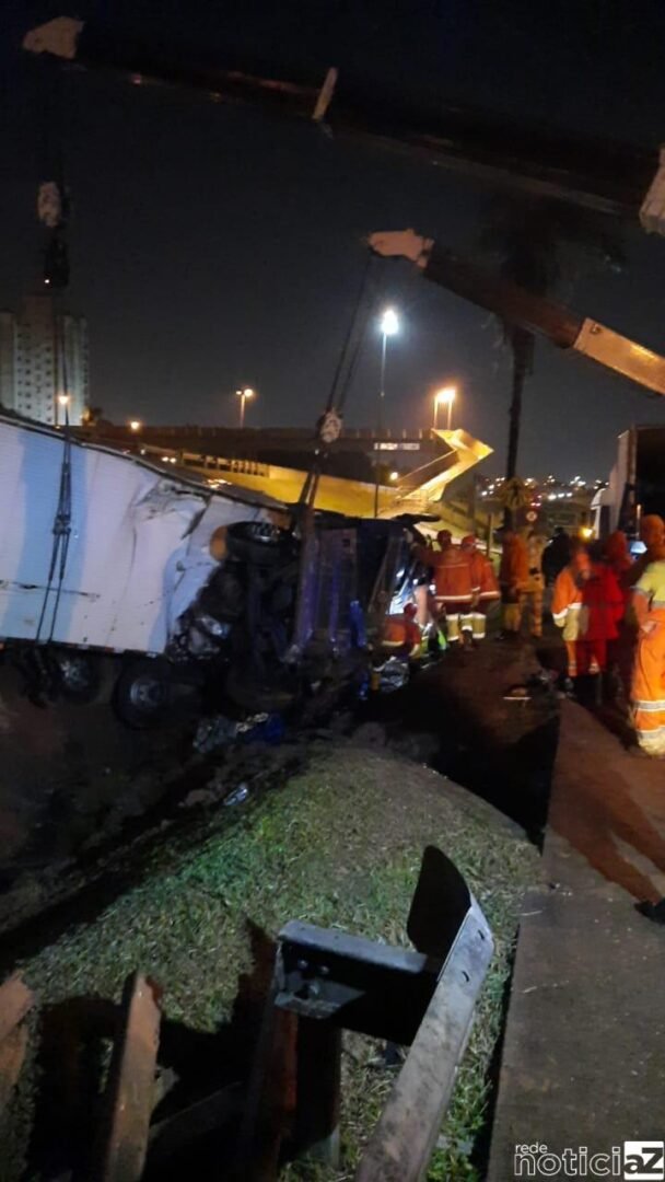 É necessário usar um guindaste para retirar uma carreta que caiu na ribanceira no km 60 da rodovia Anhanguera, em Jundiaí. O veículo estava carregada com frangos congelados e o motorista morreu.