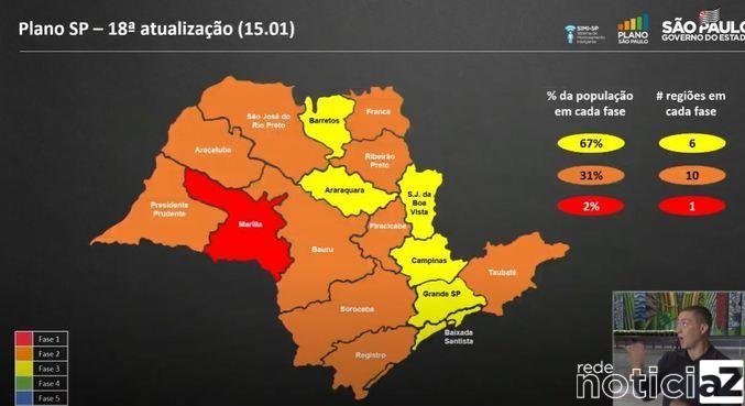 As regiões que retornaram para a fase laranja foram Araçatuba, Bauru, Franca, Piracicaba, Ribeirão Preto, São Jose do Rio Preto e Taubaté, onde também está inserido o Litoral Norte. Já a região de Marília está na fase vermelha, a mais restrita, que só permite funcionamento de serviços essenciais, como farmácias, supermercados, padarias e hospitais, além de serviços de segurança.
