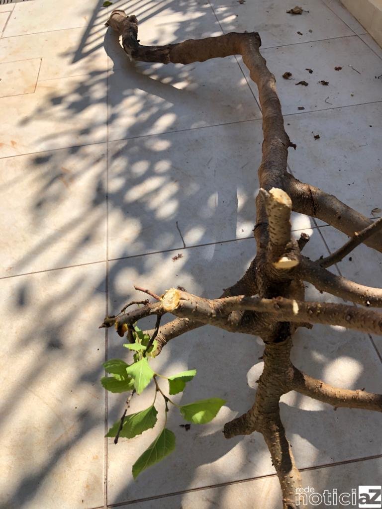 A equipe composta pelos policiais Márcio e Wacheisk recebeu uma denúncia de uma árvore estava sendo cortada no meio da calçada da Rua Atibaia, no bairro Colônia. O responsável foi autuado com uma advertência e recebeu uma notificação. Mas terá de realizar o agendamento ambiental no próximo dia 27 de maio.