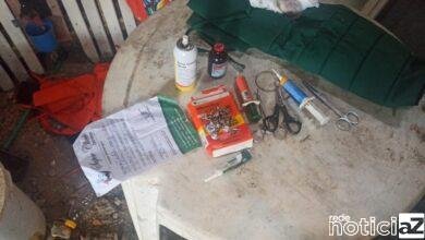 Localizado também medicamentos e materiais para uso veterinário, esporas, luvas de borracha, seringas e biqueiras. Todos materiais utilizados na prática da rinha.