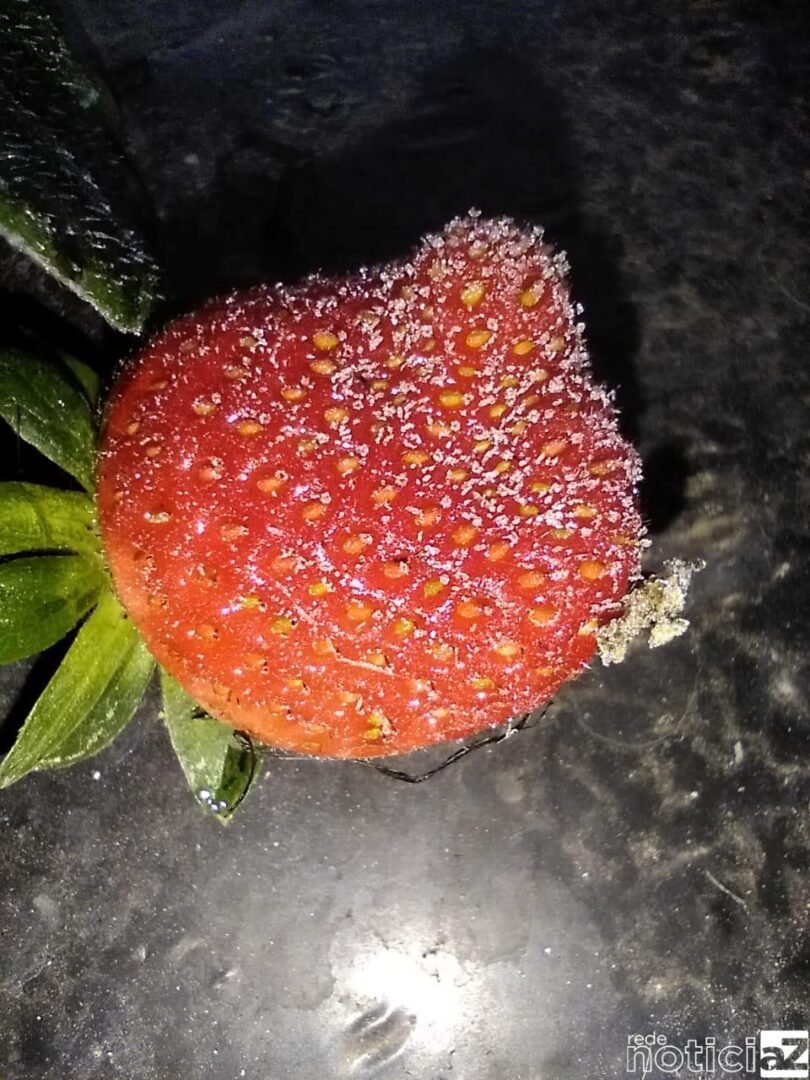 No Campo dos Aleixos, a estimativa é que 70% da produção de morango foi perdida devido ao frio intenso. O cenário que os produtores encontraram ao acordar foi de folhas e flores cobertas por uma camada de gelo.