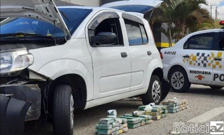 Foi dada ordem de parada ao veículo e durante a vistoria foram encontrados 20 quilos de maconha, que estavam escondidos na lataria do carro.