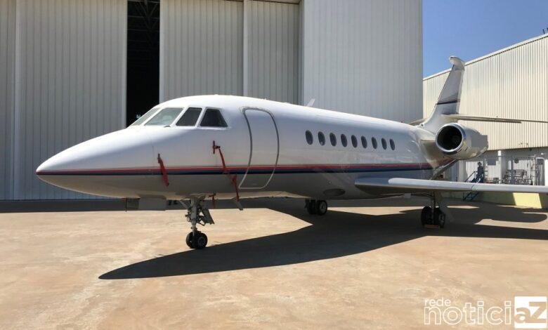 Segundo a Receita Federal, o Jato executivo é do modelo Dassault Falcon 2000 e foi fabricado em 1998. Cabem 10 passageiros na aeronave e possui alcance intercontinental.