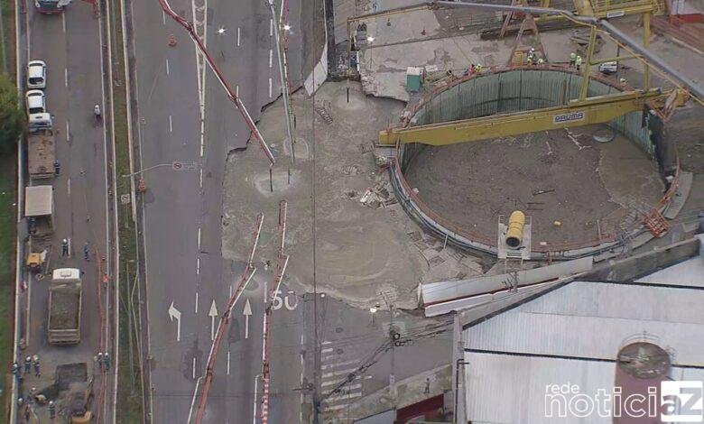 A cratera se rompeu, na última terça-feira, na obra da futura Linha-6 Laranja do Metrô, devido ao rompimento de uma galeria de esgoto. O reparo da tubulação, entretanto, ainda não tem prazo para iniciar. Para chegar a esta etapa, será necessário retirar a água poluída que invadiu a construção. Isso será feito pelo poço do Metrô, que fica ao lado contrário da marginal.