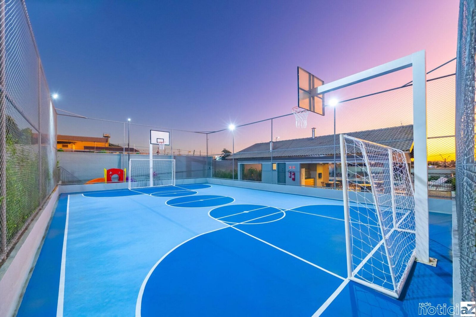 Também há o uso de piso emborrachado no playground, o botão de segurança que desativa a bomba da piscina em caso de acidente, a trava mecânica no portão de entrada da piscina. Dessa forma, pode evitar que crianças entrem sozinhas na área e o quadro sinóptico para automação da iluminação externa. Ela é totalmente equipada com lâmpadas de LED, mais econômicas.