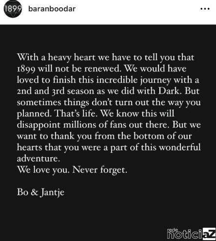 É com o coração pesado que temos que dizer que 1899 não será renovada. Adoraríamos ter encerrado essa jornada incrível na segunda e na terceira temporadas, como foi com Dark. Mas, às vezes, as coisas não acontecem conforme o planejado. É a vida. Sabemos que isso decepcionará milhões de fãs por aí. Mas queremos agradecer a todos do fundo de nossos corações por fazerem parte dessa aventura. Amamos vocês, nunca se esqueçam”