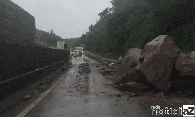 Segundo a Polícia Rodoviária Federal, pedras da encosta da pista deslizaram em decorrência da chuva e chegaram a atingir uma carreta. O motorista não ficou ferido.