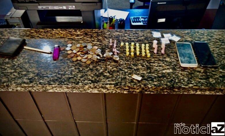 Sendo assim, com ele foram encontrados 21 pedras de crack, 10 invólucros de maconha e 8 eppendorfs de cocaína.