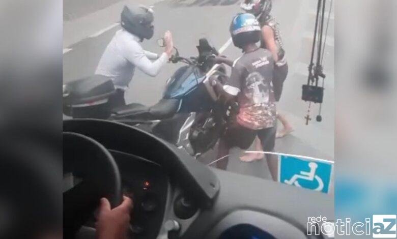 Ainda de acordo com as informações, o motociclista aparece sentado na moto quando uma dupla para do lado e tenta roubar o veículo.
