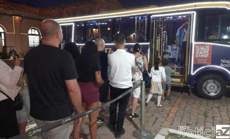 Micro-ônibus iluminados com LED, parte do Circuito Natal Luz, funcionarão até sexta-feira, facilitando acesso ao comércio e lazer