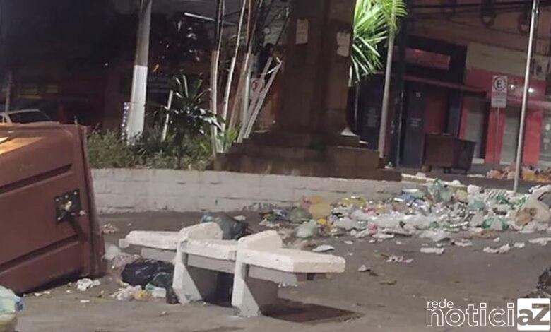 Caçambas foram viradas, sacos de lixo foram rasgados e espalhados pelas ruas e calçadas. Esta é a segunda vez nos últimos dias que ações de vandalismo desse tipo são registradas.