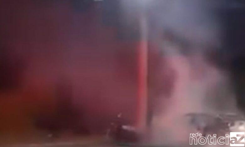 Veículo pega fogo após colidir com poste na madrugada de terça-feira (26), na avenida Caetano Gornatti, no Engordadouro, em Jundiaí.