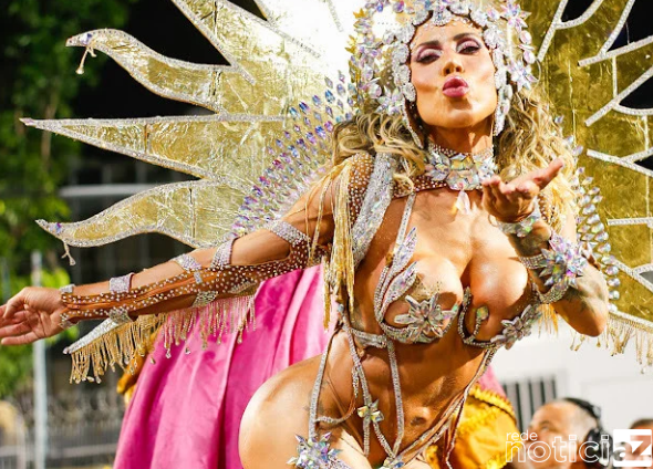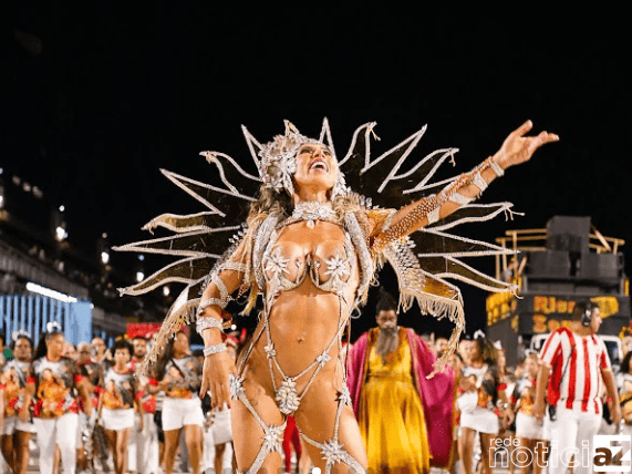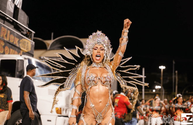 Rainha de bateria esbanja samba no pé e look ousado com 150 mil cristais boreais