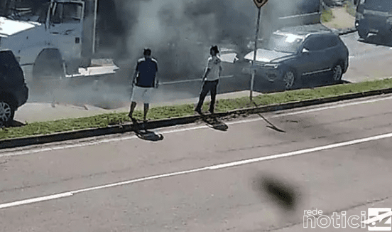 A situação começou com um caminhão que teve um princípio de incêndio, a ação rápida de populares ajudou motorista utilizando extintores de incêndio. Contudo, a complicação não parou por aí.