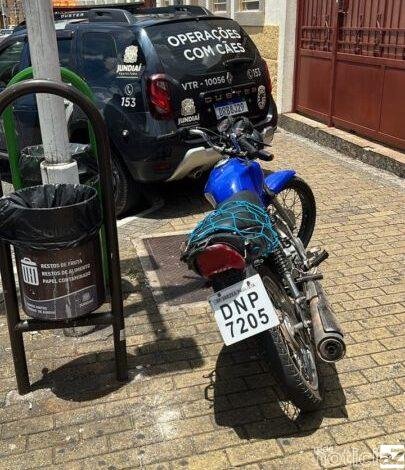 Uma motocicleta com placa artesanal – adulterada- foi apreendida no centro da cidade de Jundiaí. O veículo chamou atenção da Guarda Municipal de Jundiaí (GMJ) e a equipe de Canil, ao passar em alta velocidade na região do Fórum.
