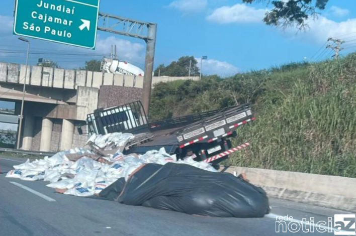 Na tarde desta segunda-feira (11), um caminhão teve sua carga tombada na Rodovia Dom Gabriel, no sentido Jundiaí, resultando na interdição de uma das faixas.
