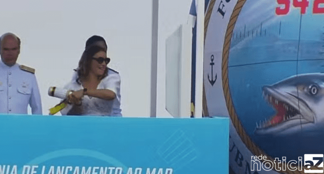 A primeira-dama Janja batizou o submarino Tonelero (S42) durante o lançamento da embarcação ao mar no Complexo Naval e Industrial de Itaguaí (CNI), na presença do presidente Luiz Inácio Lula da Silva e do presidente francês Emmanuel Macron, em visita oficial ao país.