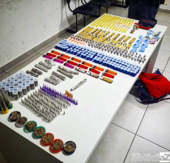 Durante a revista pessoal e nas sacolas, os policiais encontraram 1 kg e 300 gramas de maconha, 100 gramas de skank, 200 gramas de lança-perfume, 100 gramas de crack, um rádio comunicador e dinheiro em espécie.