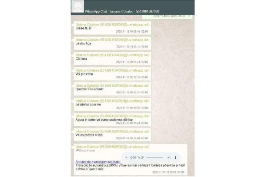 Por fim, há também informações que levam a contatos e mensagens trocadas entre os envolvidos. Na cidade de Cubatão, foram divulgadas conversas entre os o vereador Ricardo Queixão (PSD), o advogado Áureo Tupinambá e a servidora Fabiana de Abreu Silva foram presos durante a Operação. A expectativa é que material semelhante seja obtido em Itatiba.
