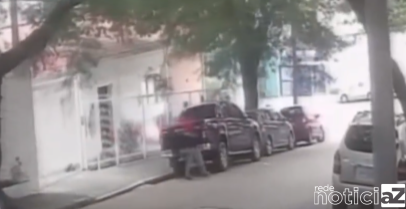 As imagens mostram dois suspeitos andando próximo ao veículo até que retornam e entram no carro.