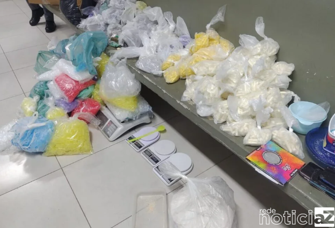 Após uma vistoria no imóvel, foram apreendidos mais de 35 quilos de drogas, incluindo cocaína, maconha, crack, skunk e lança perfume, além de materiais para embalagem e produção de drogas.