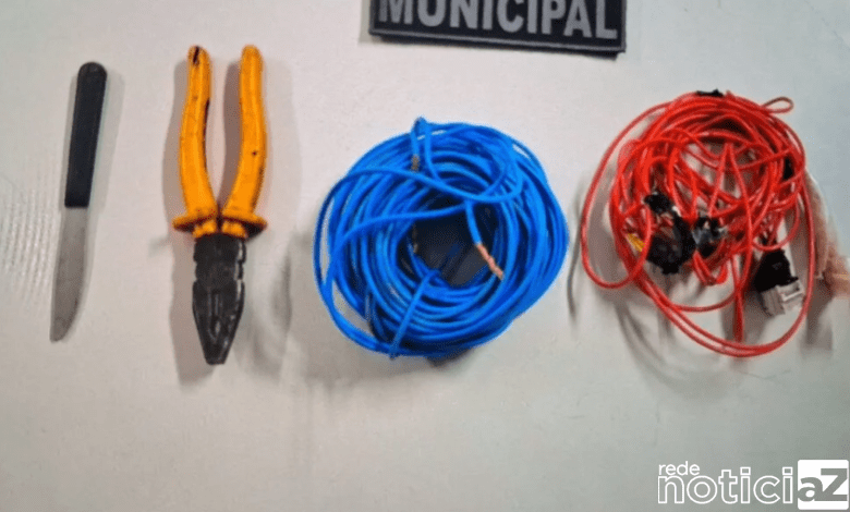 Ao chegarem à obra, que possui quatro andares, os guardas flagraram o suspeito carregando uma bolsa que continha aproximadamente 50 metros de fios, além de uma faca e um alicate, objetos que seriam utilizados no furto.