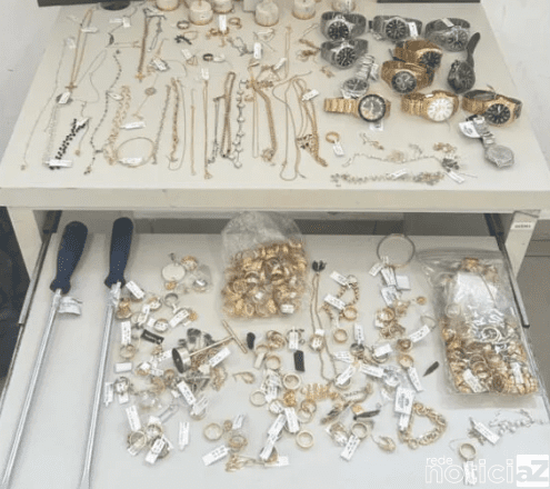 Com o criminoso, os policiais apreenderam diversas joias furtadas da loja.